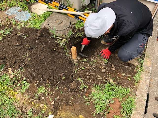 今日は水道管の取出し状況~の仮設給水管敷設作業です